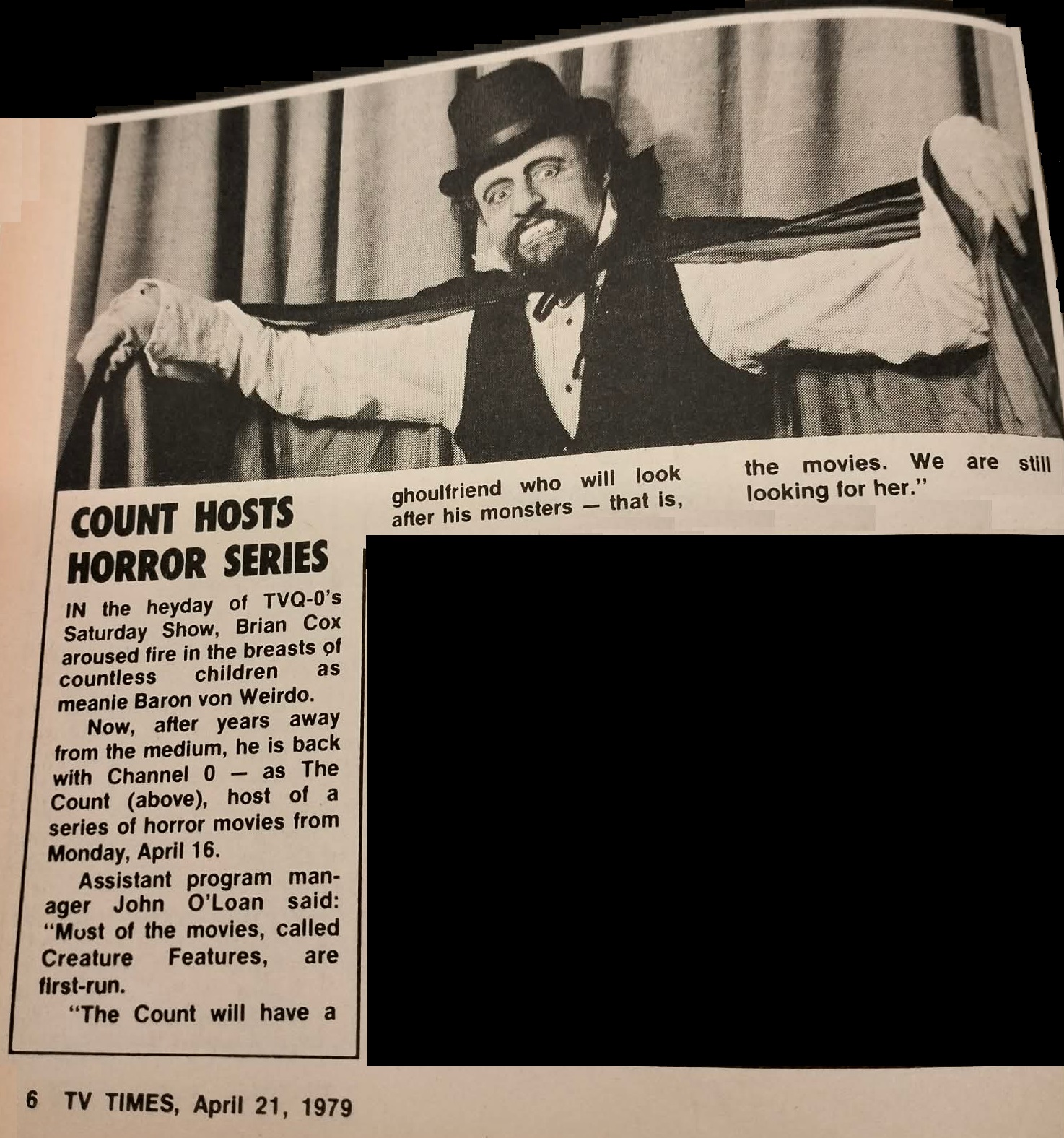 | "Creature Features" was a hosted horror movie show with Elizabeth Falconer as "Vampira" and Brian Cox as "The Count" hosting horror movies on TVQ Channel 0 (Brisbane, Queensland) on Monday nights during 1979.
