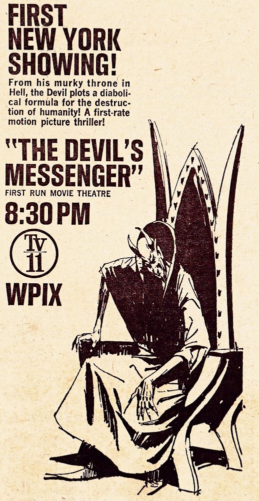| "The Devil's Messenger" was a 1962 anthology horror movie from Sweden and USA. It tells the story of Satan (played by Lon Chaney Jr.), enlisting the aid of a suicide victim to lure people into Hell.