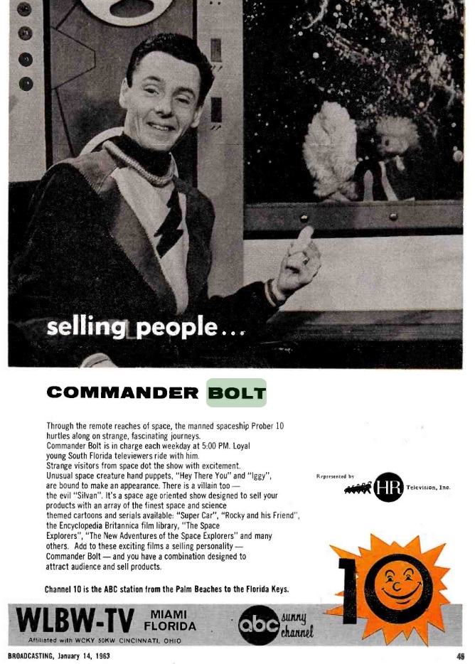 Commander Bolt ran his show from his spaceship Prober 10. The Commander took his audience on strange and fascinating journeys. Unusual creatures included "Hey There You" and "Iggy"; along with the evil "Silvan".