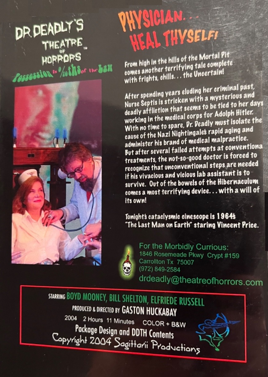 | "Dr. Deadly's Theatre of Horrors" was a Dallas cable (Carrolton Local 3) hosted movie show which aired old horror movies, with vignettes between the commercial breaks. During the vignettes "Dr. Deadly" set up the movie, did experiments in his laboratory, and the other characters were all involved in a plot line unto itself.