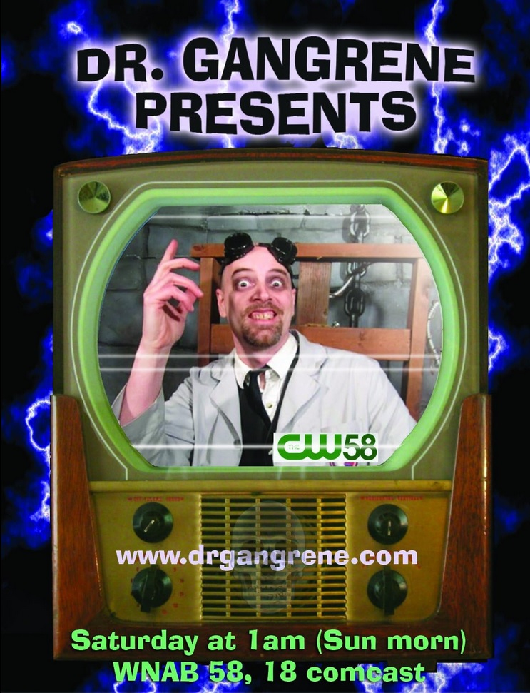 Dr. Gangrene Presents is the new half hour show hosted by Dr. Gangrene. It began on 24 September, 2011 and aired on Saturday nights on CW58 in Nashville, Tennessee.