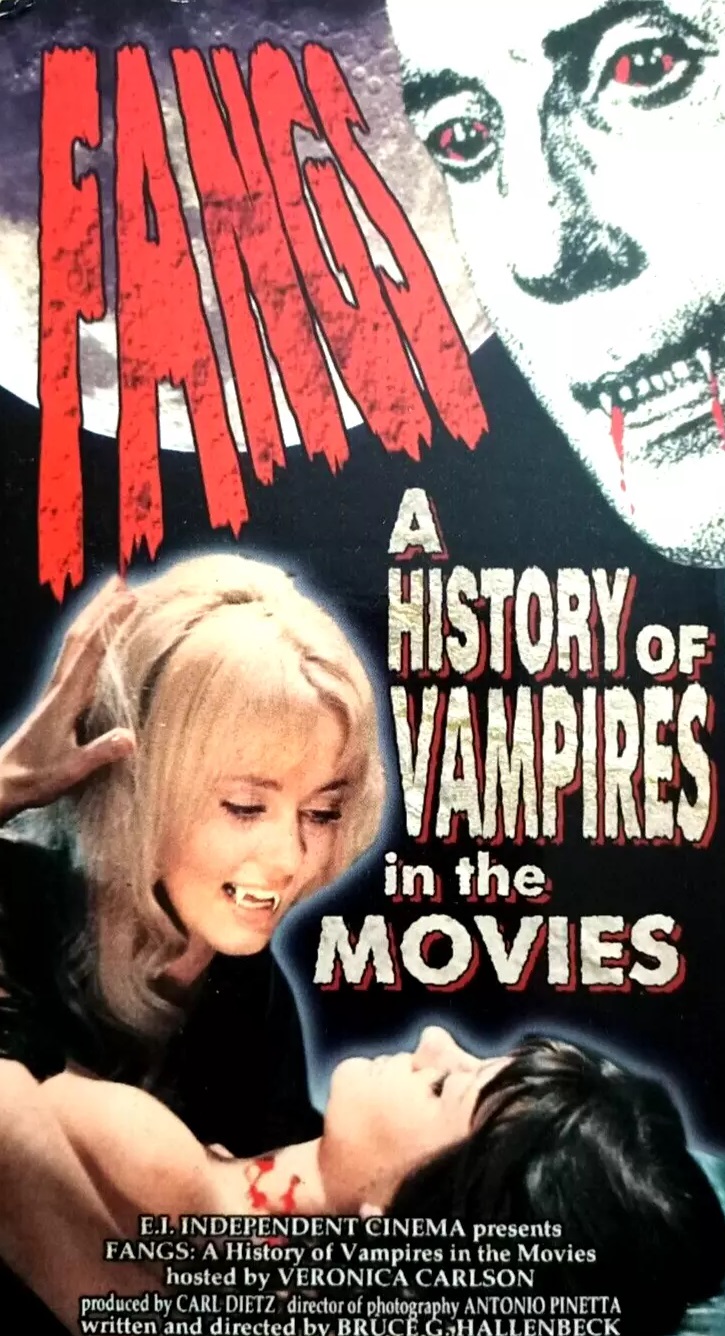 "Fangs! A History of Vampires in the Movies" is a 1989 direct-to-video horror documentary. Veronica Carlson, star of various Hammer films including "Dracula Has Risen From The Grave", hosts this 57-minute documentary that takes a look at the history of vampire films. The documentary has Carlson narrating small bits of information while also screening trailers to various movies.