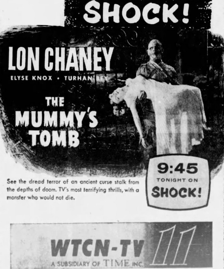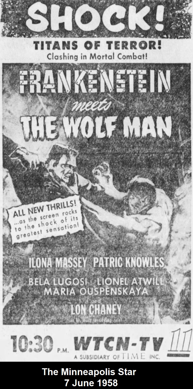 | "Shock!" (aka "Shock Theater") was a hosted horror movie show, with host Mel Jass. The show was screened on WTCN-TV, Channel 11 in Minneapolis, Minnesota, USA; commencing on 1 February 1958; every Saturday at 10:30pm. The show presented and screened the 52 Universal horror movies, with the first being the 1931 horror movie "Frankenstein". The show likely ended in early 1959.
