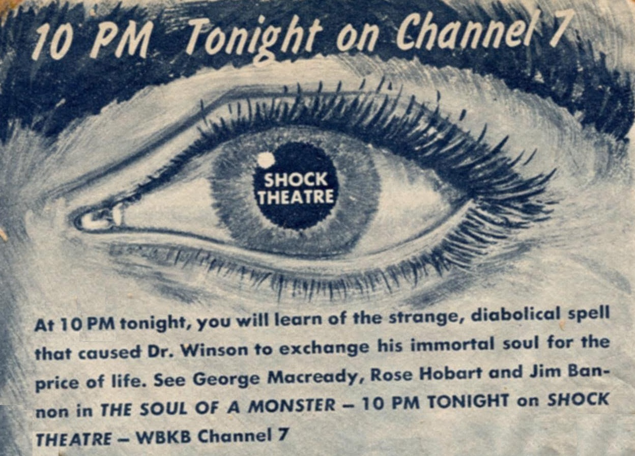 "Shock Theatre" was a hosted horror show with Terry Bennett as "Marvin" presenting movies on Saturdays at 10:00 pm on WBKB-TV Channel 7 Chicago, Illinois from 7 December 1957 - August 1959.