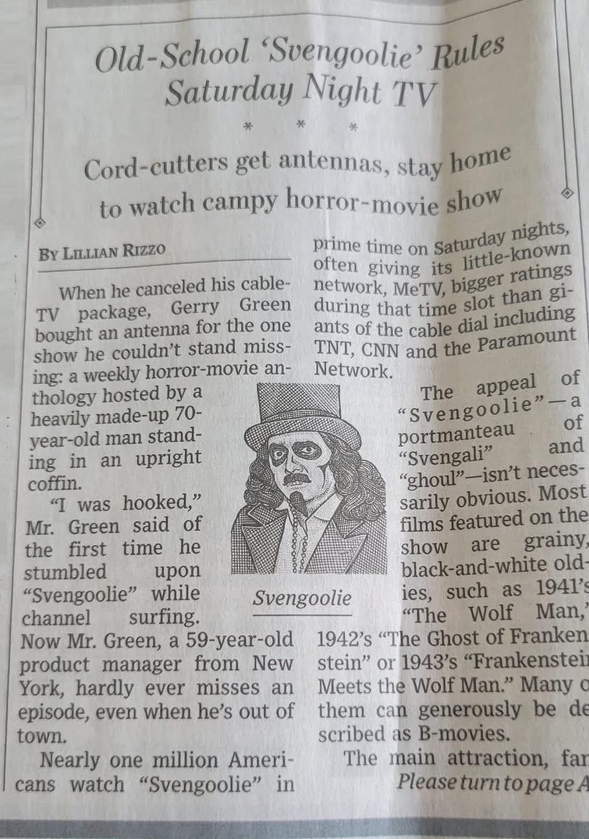 Son of Svengoolie (1978-1986) ![]() "Son of Svengoolie" was a hosted horror movie show with Rich Koz as "Son of Svengoolie" from 1978 until 1986; originally aired on WFLD 32 in the Chicago area.