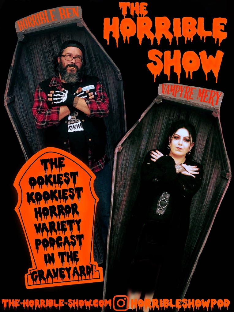 | "The Horrible Show" is a hosted horror podcast since 2021, with hosts Ben Reynolds as "Horrible Ben", Mery Munster as "Vampyre Mery"; and "Ichabod Moundshroud" (librarian at the Tomb of Tomes).