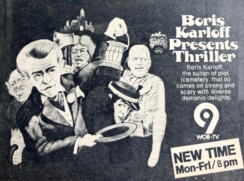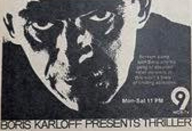 | "Thriller" was a hosted triller/horror anthology television series with Boris Karloff as host, screening on NBC. Thriller, at first, told stories of crime and mystery, but later morphed into a series of gothic horror tales. Many of the screenplays were based on works by authors such as Cornell Woolrich, Robert Bloch, and Charlotte Armstrong.
