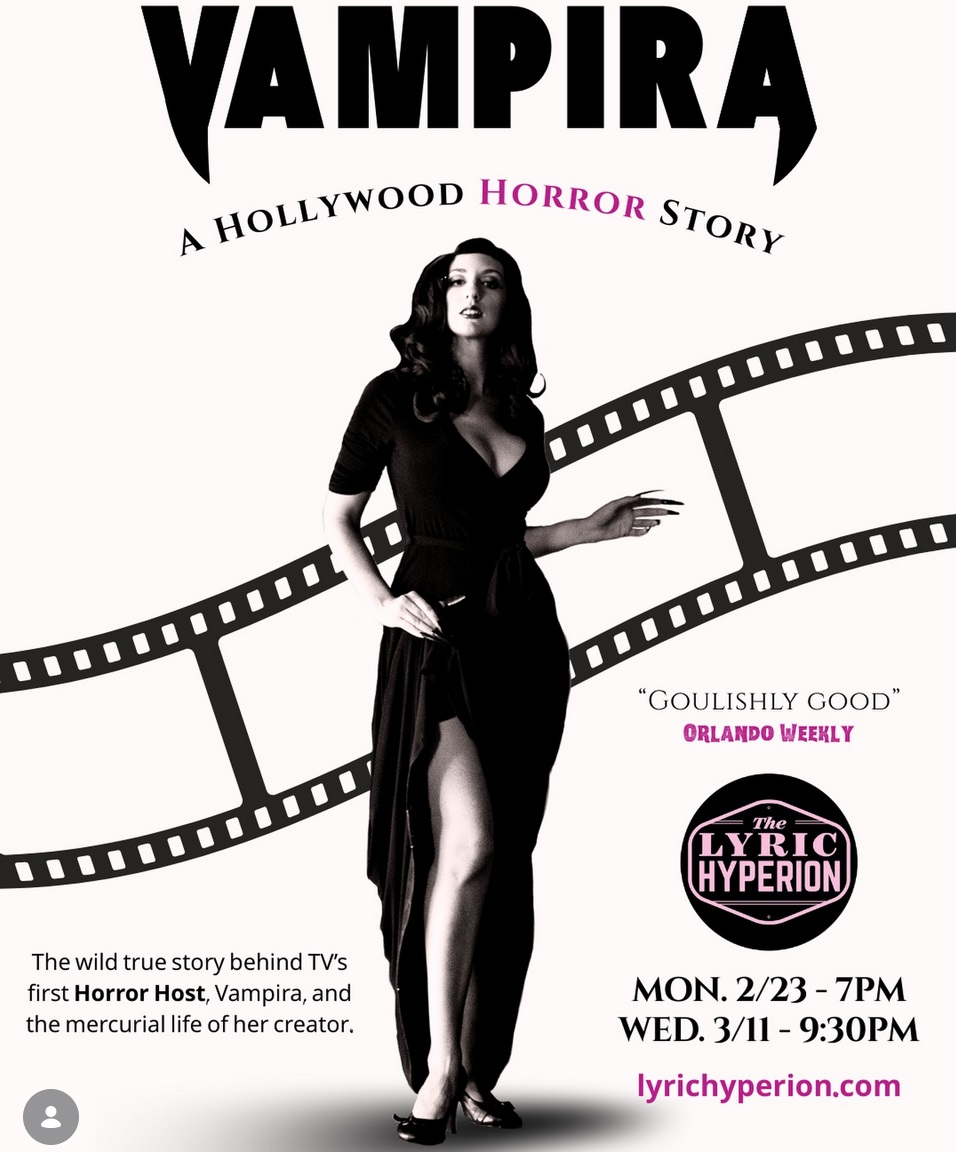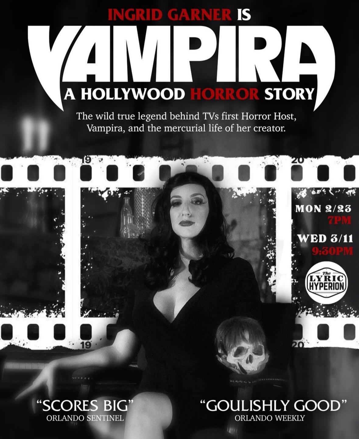 "Vampira: A Hollywood Horror Story" showcases the life of the iconic horror TV host and the enigmatic creator behind her. Award-winning performer Ingrid Garner brings this multimedia production to life, exploring the legacy of Vampira through a blend of storytelling and visual elements. The show promises to delve into the thrills and challenges of defining the horror genre on television during its inception. Running from January 8 to January 11, 2026, as part of the Winter Mini-Fest at Orlando Fringe, it offers a unique retrospective on a cultural icon. The show also was performed on 23 February 2026 & 11 March 2026 at The Lyric Hyperion in Silverlake, Los Angeles, USA.