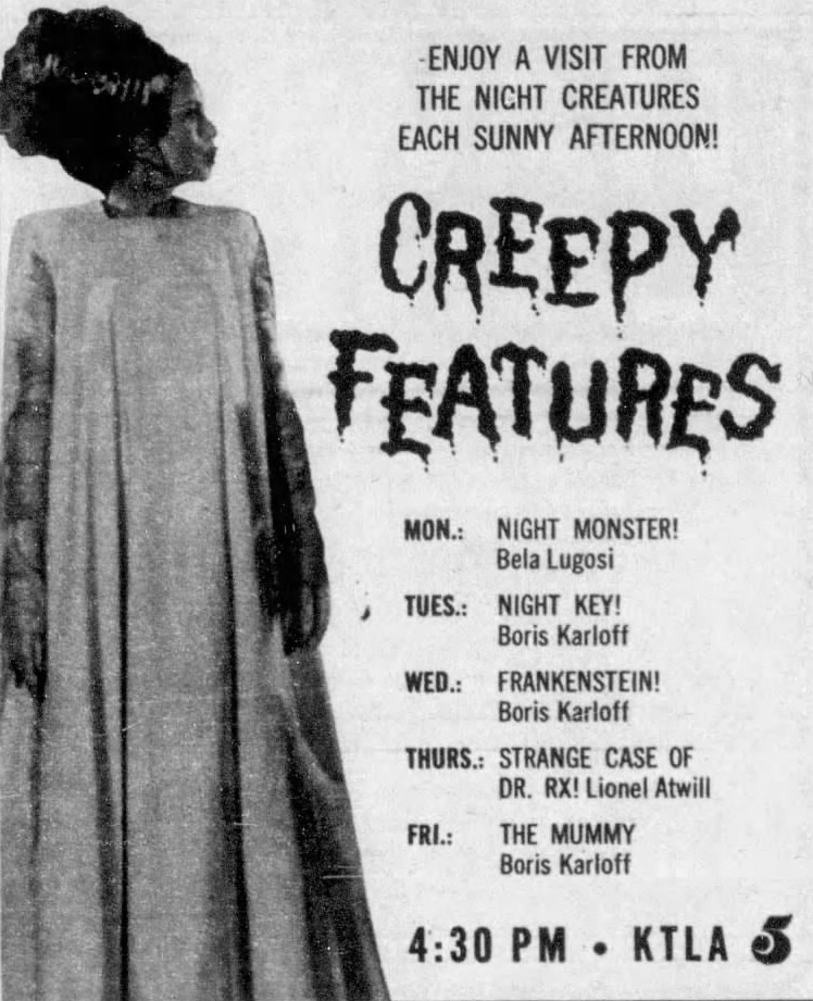 | "Creepy Features" was a non-hosted five day horror movie show screened at 4:30pm on KTLA - Channel 5 in Los Angeles, California, USA. The dates and year are not known. The movies shown included: Monday: "The Invisible Man" Tuesday: "Mystery of the White Room" Wednesday: "Mystery of Edwin Drood" Thursday: "The Black Cat" Friday: "The Invisible Man Returns"