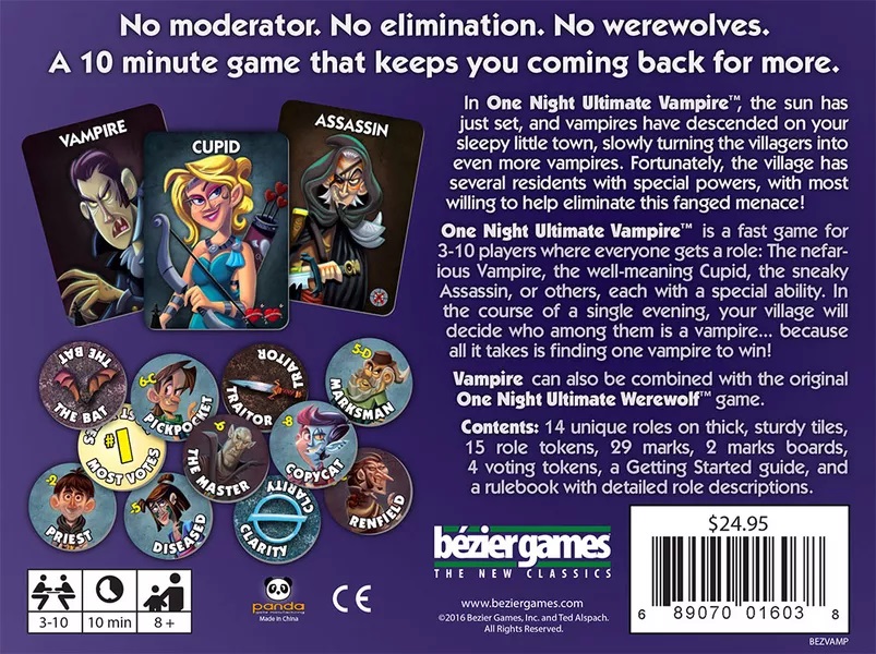 "One Night Ultimate Vampire" is a fast game for 3-10 players in which everyone gets a role: The nefarious Vampire, the well-meaning Cupid, the sneaky Assassin, or others, each with a special ability. In the course of a single evening, your village will decide who among them is a vampire... because all it takes is finding one vampire to win!