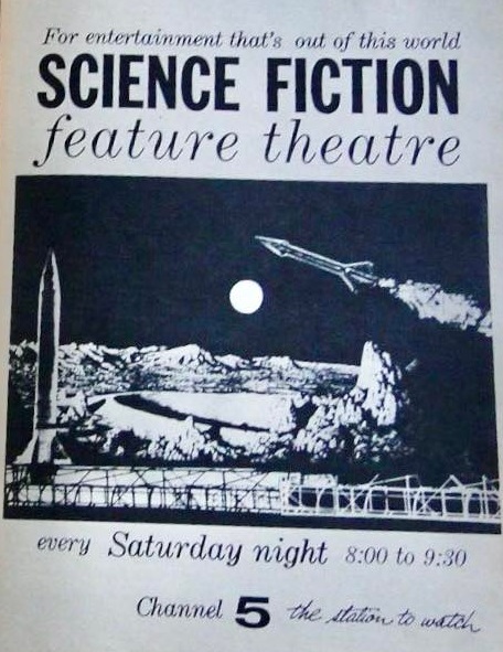 | "Science Fiction Feature Theatre" was a science fiction movie show, likely non-hosted. The show screened on Channel 5, on Saturday nights between 8:00pm to 9:30pm. There is very little information available on this show, dates that it aired, the station, etc. |