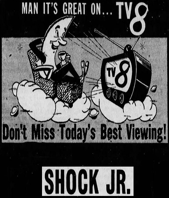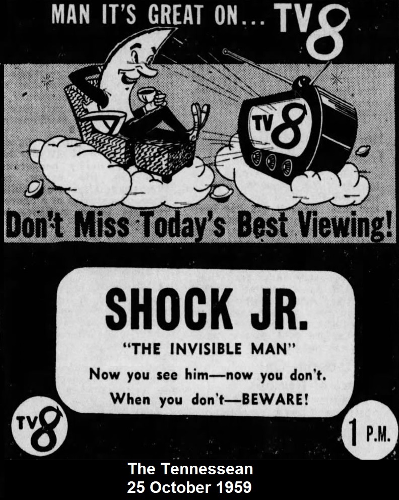 | "Shock Jr." was a non-hosted horror movie show on WNPT Channel 8 in Nashville, Tennessee, USA; on Sundays at 1:00pm, likely around 1959 to 1960.