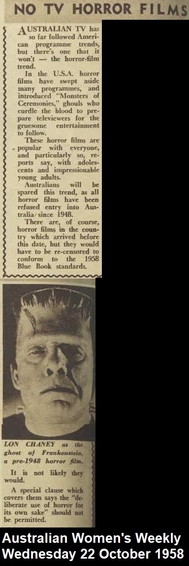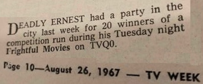 | It's another deadly day on our Australian horror host excursion. Today I present Deadly Earnest, host of Deadly Earnest's Aweful Movies on TVQ-0 in Brisbane, Australia. Since the show was not networked back in the mid 1960's, each capital city had their own version of Deadly Earnest, each independent from the others. The show in Brisbane started in 1968 and only lasted about 4 months. In an interview, Shane Porteous, who played the Brisbane Earnest, said that the studio couldn't afford to let him screen the movies he was showing. Shane recalled that his only set was the coffin from which he emerged. Porteous' Earnest was part vampire and part zombie and walked like Frankenstein's monster. When he left for Sydney, Porteous was "killed" and replaced by Professor MacAbre. There's no known existing footage of Shane as Deadly Earnest and only two images are known to exist. |