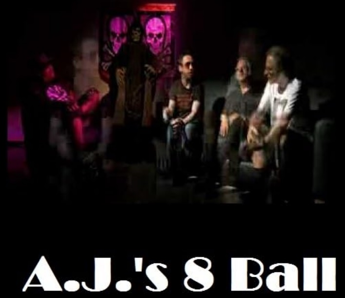 | "A.J.'s 8 Ball" was an in-studio adventures of the horror-rock inspired, tattooed aspiring actor-turned storyteller/talk show host A.J. 8, featuring actor, writer, videographer and spoken word artist Mike Phelan O'Toole as A.J.'s quick-witted co-host, and the musical stylings of acoustic guitarist Dennis Roach. Guests include A.J.'s long-time friends, and other Boston, MA indie artists, such as local surrealist filmmaker/poet Mick Cusimano. The horror themed set design features A.J. 8's less talkative permanent guest; a skeleton named G.R. 8. Produced by A.J. 8, Mike Phelan O'Toole and Lawrence Hollie. Directed by Lawrence Hollie.