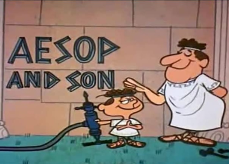 This structure was also suggested by the feature's opening titles, which showed Aesop painstakingly carving his name in marble using a mallet and chisel and then his son, with a jackhammer and raising a cloud of dust, appending "And Son". Aesop was voiced by actor Charlie Ruggles and the son, was voiced by Daws Butler. |