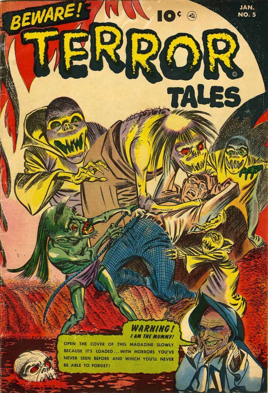| "Beware! Terror Tales" was an anthology comic featuring horror stories, hosted by "The Mummy". It was published by Fawcett Publications. The publication issued 8 editions from May 1952 until July 1953.