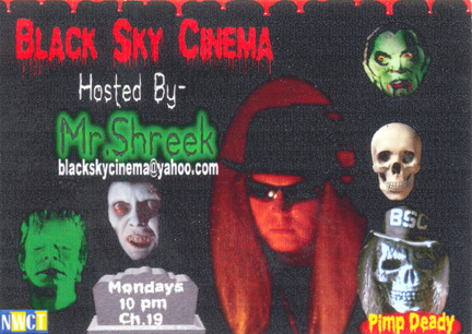 | "Black Sky Cinema" was a hosted horror movie show with John Hanson as "Mr. Shreek" presenting movies on Monday nights at 10 pm on NWCT public access Channels 19, 20 Minneapolis, Minnesota, USA; from 9 September 2003 till about January 2008.