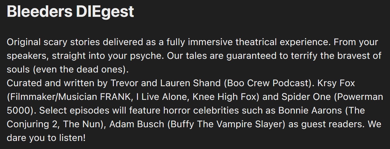 | "Bleeders Diegest" is a horror podcast.
