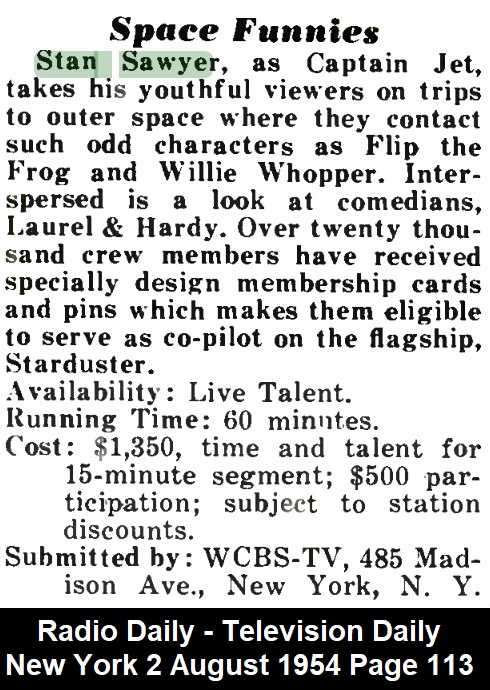 STAN SAWYER Stan Sawyer, was a radio announcer and actor in New York City who was known as "the man of a thousand voices." Around the time he was recording commercials for RCA Victor televisions and Salem cigarettes, he also starred as Captain Jet in "Space Funnies," a popular local New York children's television show.