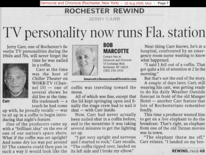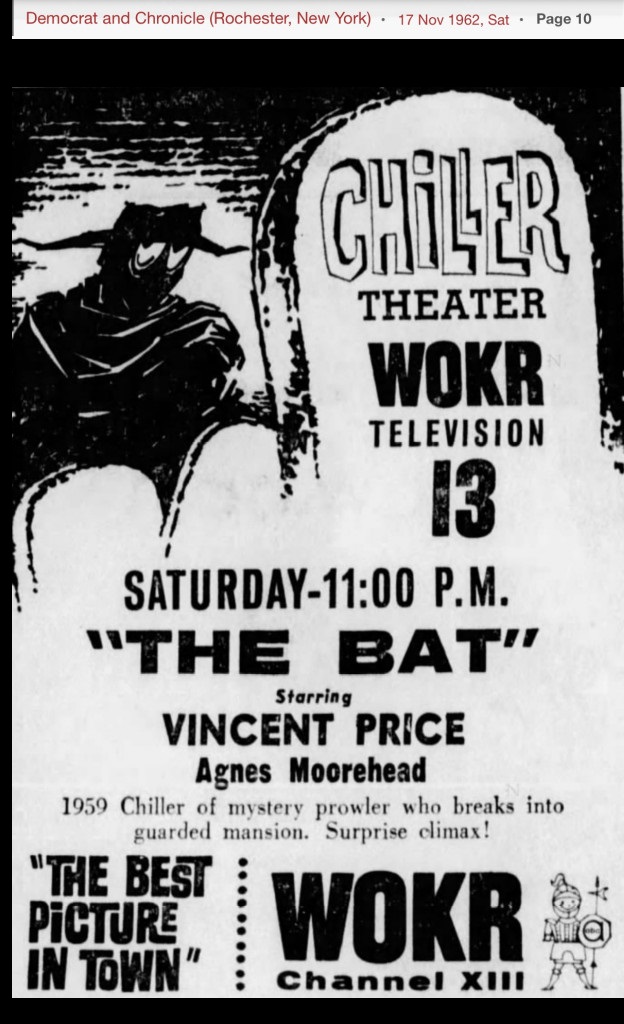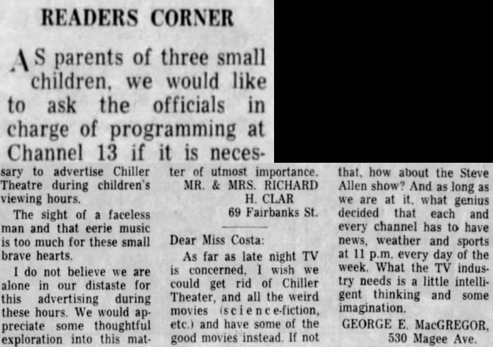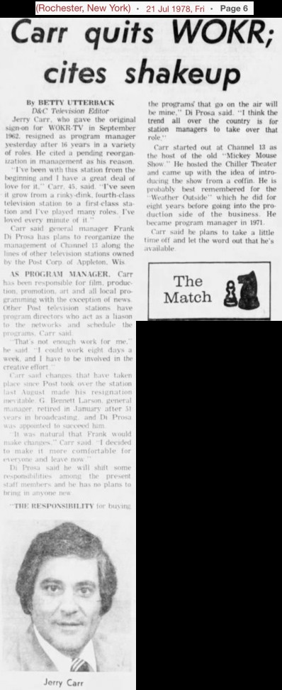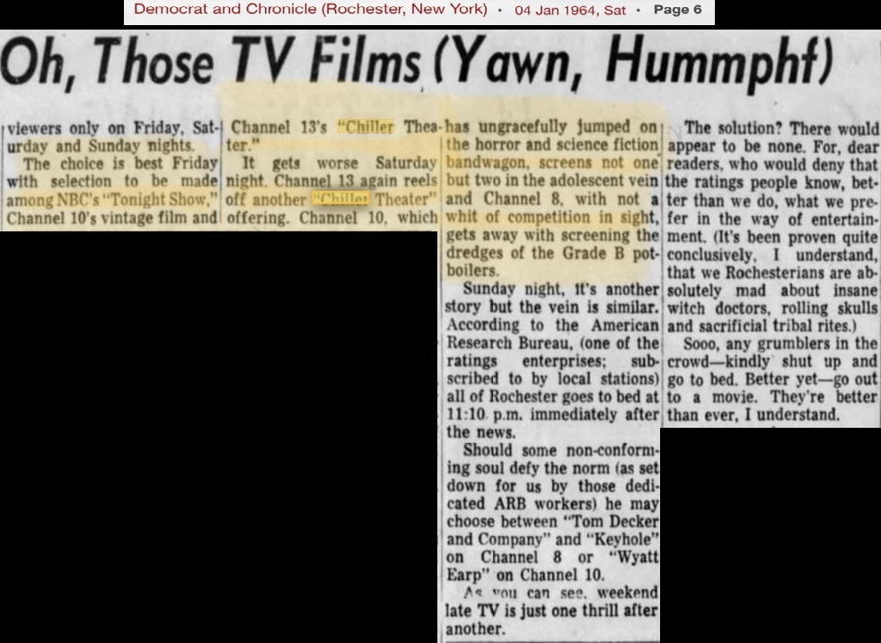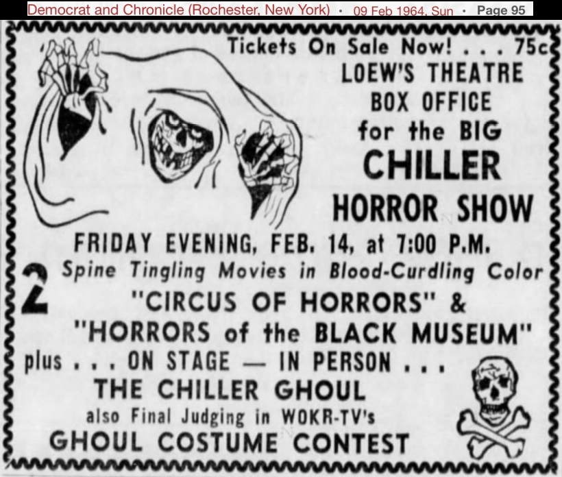 | "Chiller Theatre" (aka "Chiller Theater") was a hosted horror movie show with Jerry Carr as "The Chiller" who presented movies on WOKR-TV Channel 13, Rochester, New York from 15 September 1962 and into the mid 1960's. "The Chiller" was the horror host without a face; had his own fan club; and his show's producers cut a record that became a local hit.