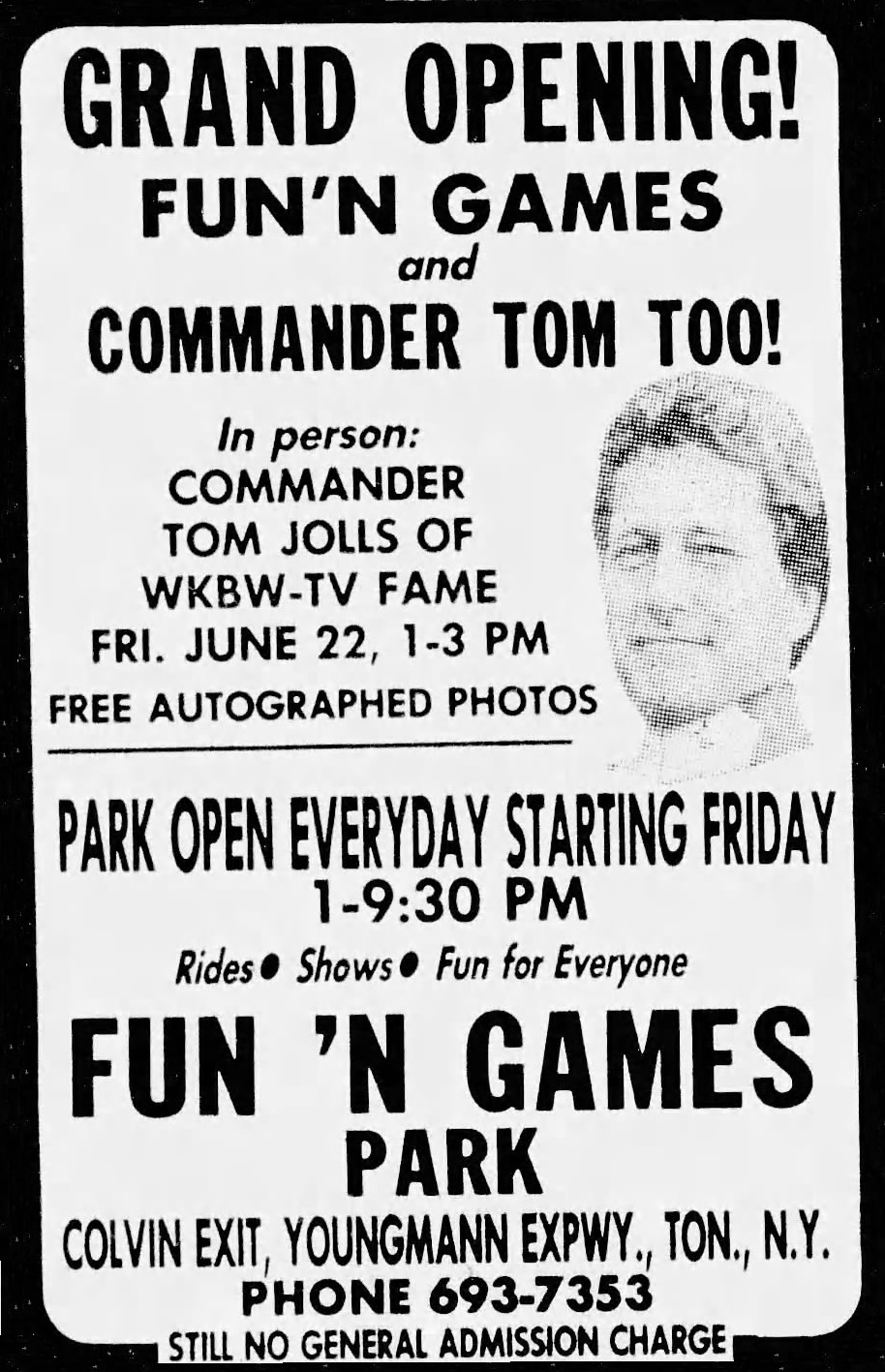 Tom Jolls was born in Newfane, New York, and grew up in Lockport, New York, where he worked at WUSJ from 1951 to 1962. His first television experience came as a personality at the short-lived WBES-TV during its three months in operation in 1953. He moved to Buffalo, working for WBEN (AM)/TV, and in 1965 was effectively traded to WKBW-TV in exchange for Stan Barron. At WKBW, Jolls became the station's evening news weatherman, and before the end of the year, he was also hosting The Superman Show—interstitial segments. These featured Jolls as Captain Tom, later Commander Tom, which aired around broadcasts of Adventures of Superman. The program evolved into The Commander Tom Show and would be on the air in various formats for 26 years.