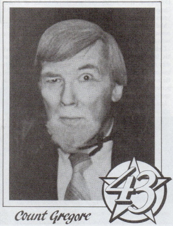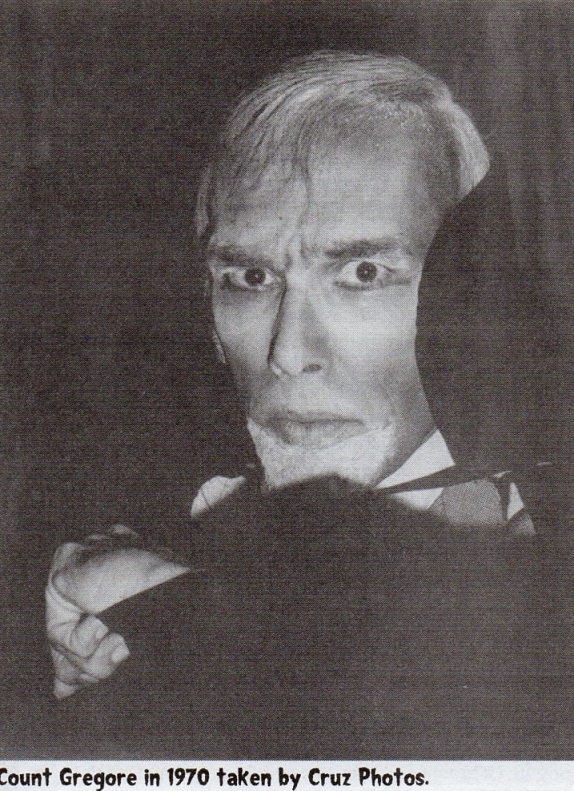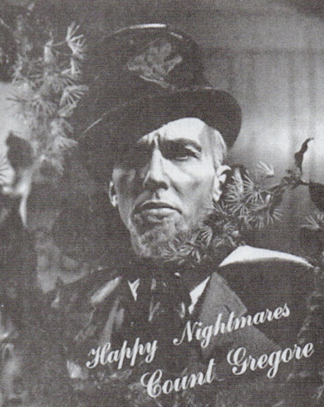 The Shows: "Shock Theater": "Count Gregore" presenting movies on Saturday nights at 11:30 on WKY-TV Channel 4 Oklahoma City, Oklahoma, from 10 May 1958 until 1961. "Thriller Theater": "Count Gregore" presenting movies on WKY-TV Channel 4 Oklahoma City, Oklahoma, from January 1962 until 1963. "Nightmare": "Count Gregore" presenting movies on KOCO-TV, Channel 5 Oklahoma City, Oklahoma from January 1965 until 1972. "Sleepwalker's Matinee": "Count Gregore" presenting movies on WKY-TV, Channel 4 Oklahoma City, Oklahoma from 1973 until 1979. "Creature Feature": "Count Gregore" presenting movies on KOKH-TV, Channel 25 Oklahoma City, Oklahoma in the late 1970's. "Count Gregore's Horror Theater": "Count Gregore" presenting movies on KOKH-TV, Channel 25 Oklahoma City, Oklahoma in the early 1980s. "Saturday Horror Theater": "Count Gregore" presenting movies on KAUT-TV, Channel 43 Oklahoma City, Oklahoma from 1984 until 1988. "Scream Country Theatre": "Count Gregore" presenting movies on KOCB Channel 34 Oklahoma City, Oklahoma from about 2000 to the early 2000's.