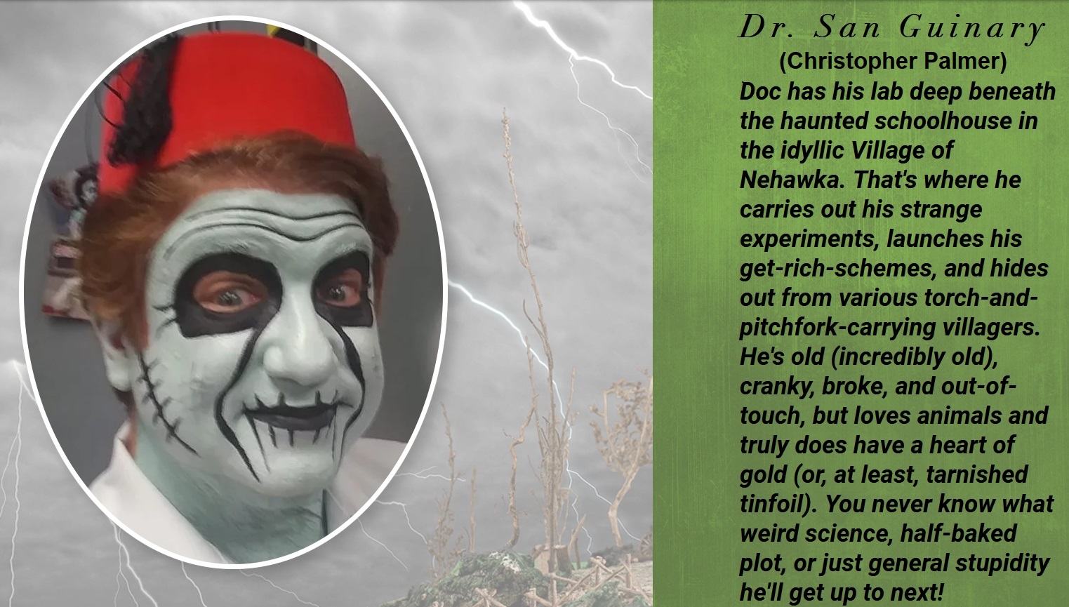 "Dr. San Guinary's Creature Feature" is a hosted horror movie show![]() with Christopher Palmer as Dr. San Guinary.