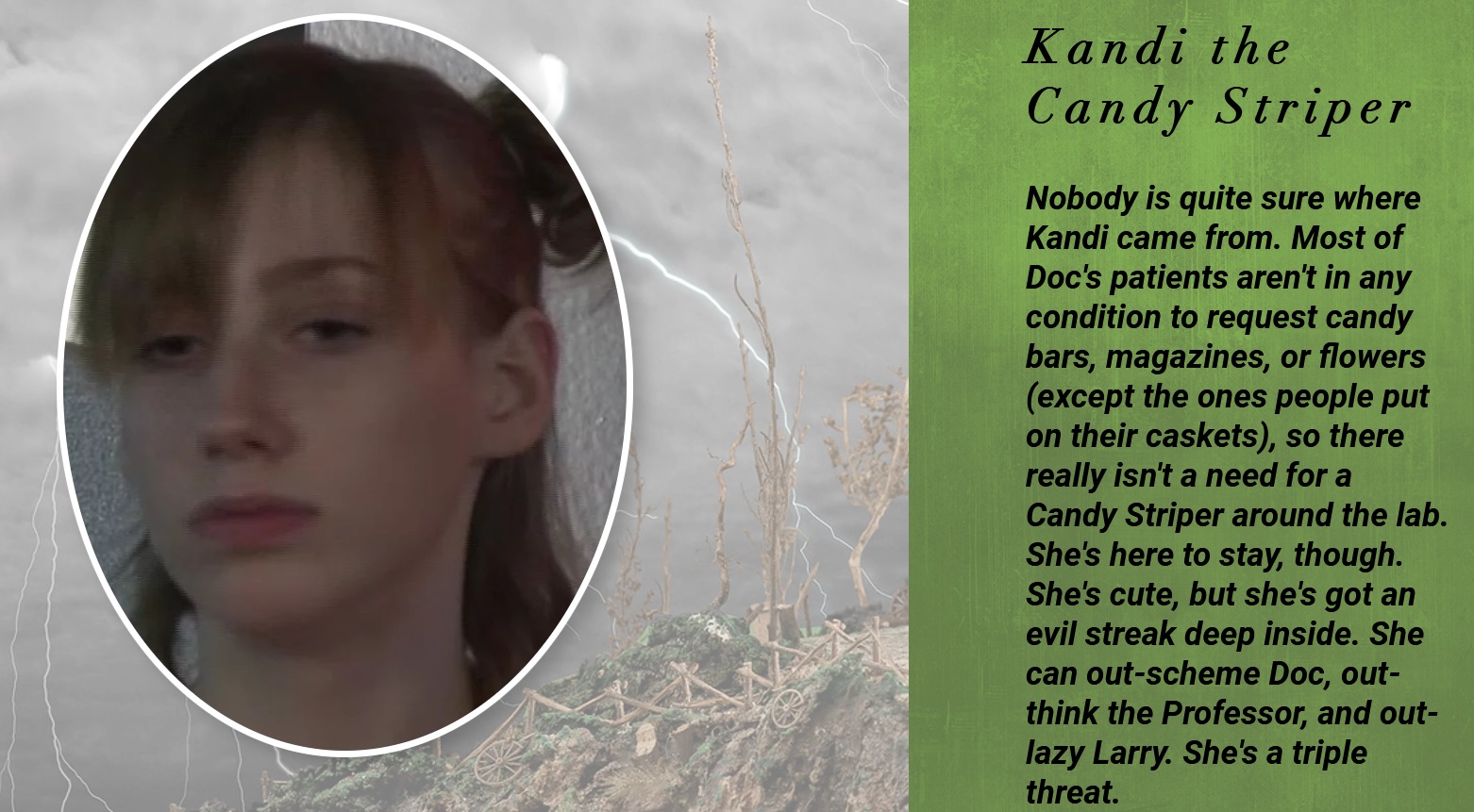 She once sold Dr. San Guinary's pants on eBay and conned him into buying them back for $25,001. Tonight I present Nurse Kerrie, Head Nurse on Dr. San Guinary's Creature Feature on Fox 42 in Omaha, NE. She's been a regular on the show since it began in 2012. Nurse Karrie may appear to be sweet and innocent but she's always scheming to put one over on the good Doc; usually involving his untimely demise, injury, or scam marriage. Although Dr. San Guinary is quite skeptical of her, he always seems to keep getting conned into her plans. Unbeknownst to the him, Nurse Kerrie utilizes his lab to host her own "Nurse Kerrie's Happy Horror Time". She is also known for her large collection of footwear and is often stalked on her Facebook page by creepy shoe fetishists, providing the Creature Feature staff with plenty of giggles.