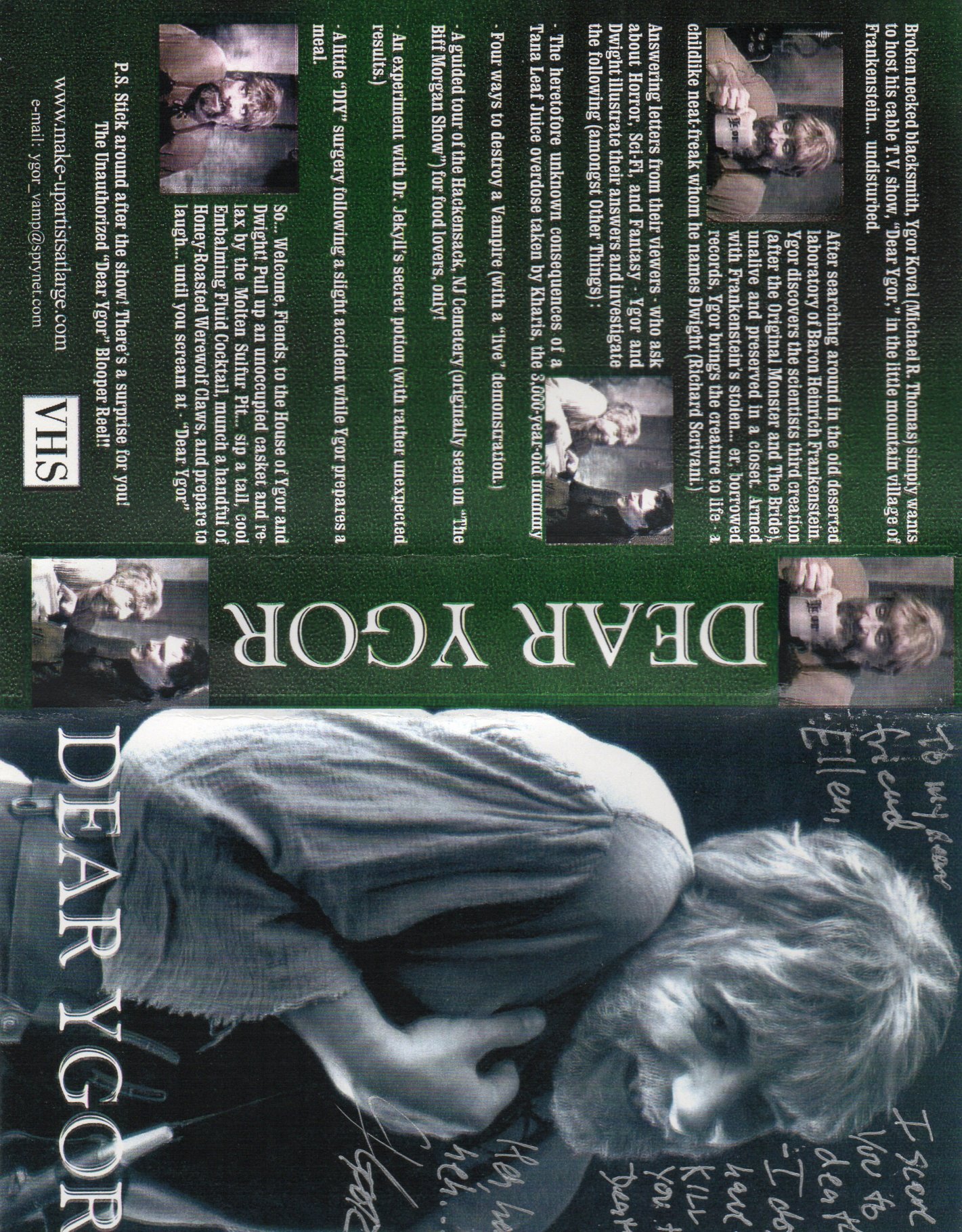 ![]() From Dear Ygor's VHS cover: Broken necked blacksmith, Ygor Koval (Michael R. Thomas) simply wants to host his cable T.V. show, "Dear Ygor", in the little mountain village of Frankenstein... undisturbed.