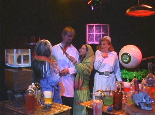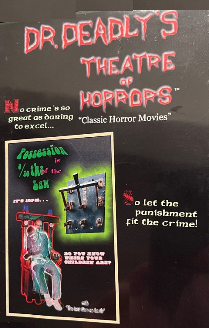 | "Dr. Deadly's Theatre of Horrors" was a Dallas cable (Carrolton Local 3) hosted movie show which aired old horror movies, with vignettes between the commercial breaks. During the vignettes "Dr. Deadly" set up the movie, did experiments in his laboratory, and the other characters were all involved in a plot line unto itself.