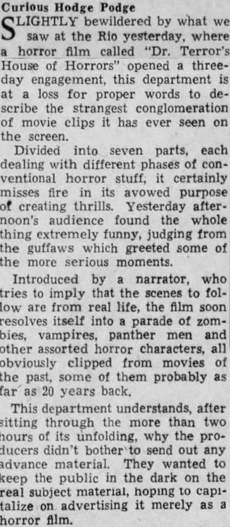 | "Dr. Terror's House of Horrors" is a 1943 fantasy / horror anthology movie, where a man of mystery known only as Doctor Terror (Basil Ruysdael) recounts seven stories from his casebook of personal encounters with evil and the supernatural.