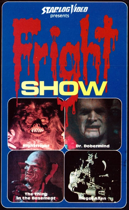 | "Fright Show" was a 1985 hosted US horror/science fiction anthology movie; that has two movies critics (Eddie Brill & Chris Phillips) showcase four short comedic horror/science fiction movies: "Dr. Dobermind" - a young girl is stalked by a creepy taxidermist. "Illegal Alien" - a group of astronauts find a huge alien egg. "Nightfright" - a young boy is convinced that a monster is hiding in his room. "The Thing in the Basement" a group of buddies are forced to take on a killer alien in their basement.