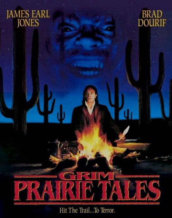 | "Grim Prairie Tales" was a 1990 USA horror anthology movie. It tells the tale of two travelers, one a well to do young clerk - Farley (Brad Dourif) on the way to a reunion with his wife, the other a scruffy, feral bounty hunter - Morrison (James Earl Jones) meet at sundown on a lonely prairie and agree to swap stories around the campfire. |