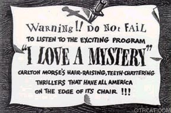 | "I Love A Mystery" was a serial adventure radio show, airing on NBC, firstly from 16 January 1939 till 27 June 1940, then with 30 minute episodes from 30 September 1940 until 29 June 1942; and then with 15 minute episodes from 22 March 1943 until 29 December 1944.