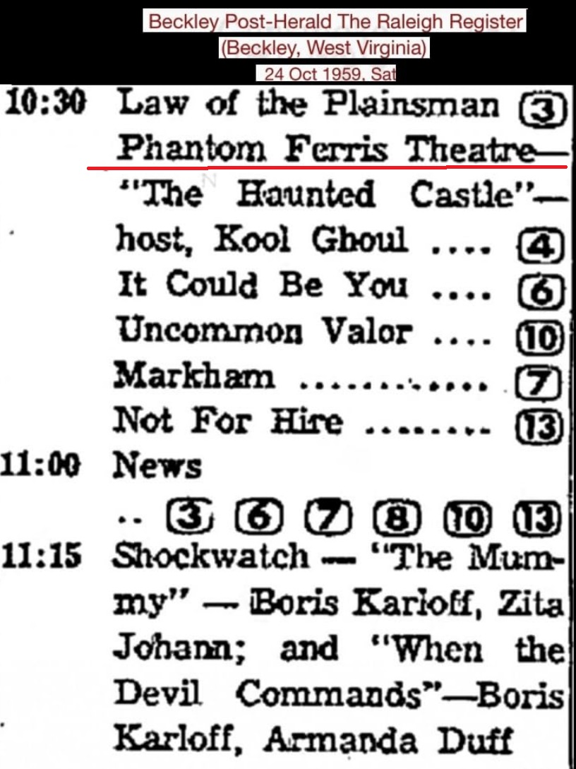 | "Phantom Ferris Theatre" was a hosted horror movie show with "Kool Ghoul" presenting movies on Saturday nights at 10:30pm on Beckley and Charleston, West Virginia from 10 October 1959 until 13 February 1960. Phantom Ferris Theatre showed a package of low budget British horror and mystery films, and one USA film, "The Corpse Vanishes". The name of the host is not known.