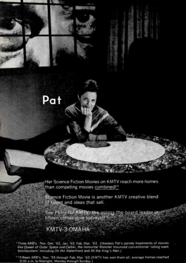 | "Science Fiction Movie" (aka "Science Fiction Movie Party") was a hosted science fiction / horror movie show with Patricia Jones as "Science Fiction Pat", hosting movies on KMTV-TV Channel 3 in Omaha, Nebraska, USA on Saturday nights from 22 September 1962 until the summer of 1964; with Ronnie Bounds and her cat Yatchie taking over from the summer of 1964 until the summer of 1965.