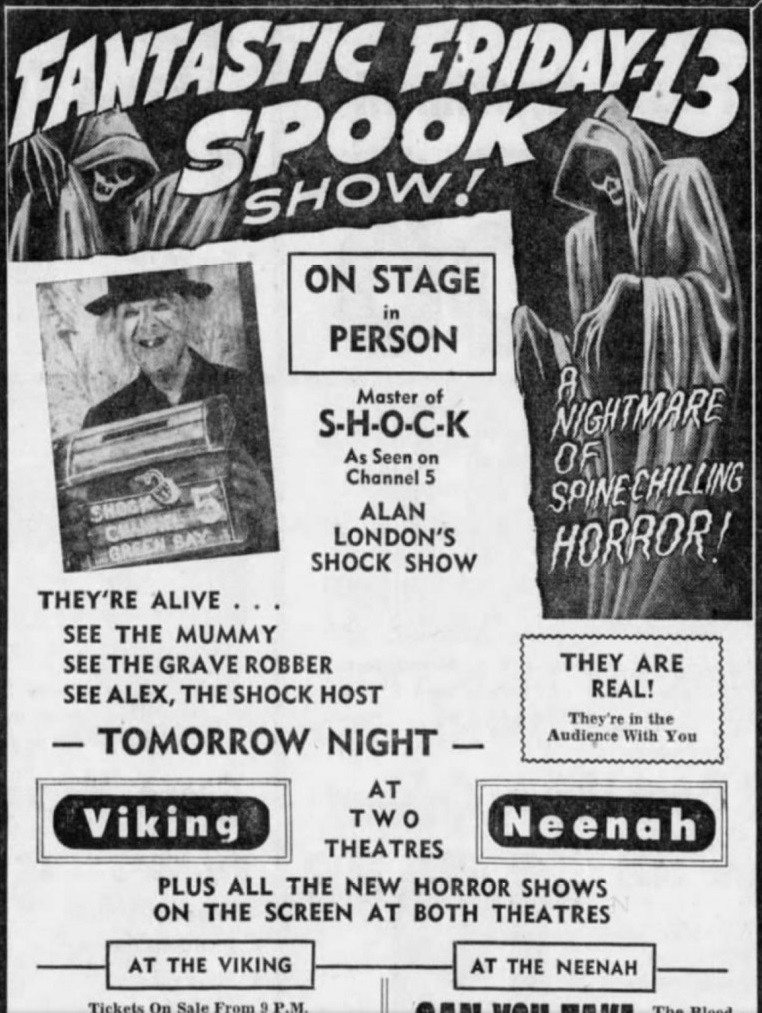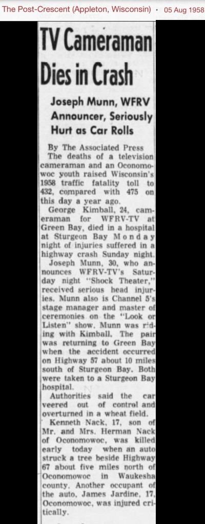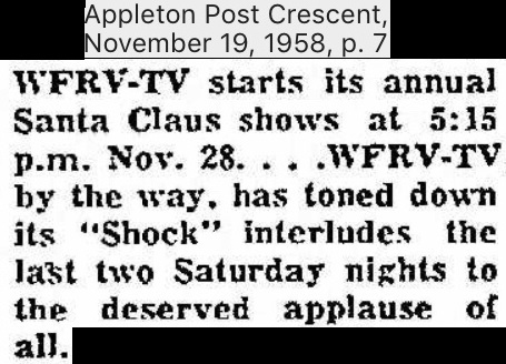 | "Shock" (aka Shock Theater) was a hosted horror with movie show with Joe Munn, aired by WFRV-TV Channel 5 Green Bay Wisconsin between 1958 and 1959.