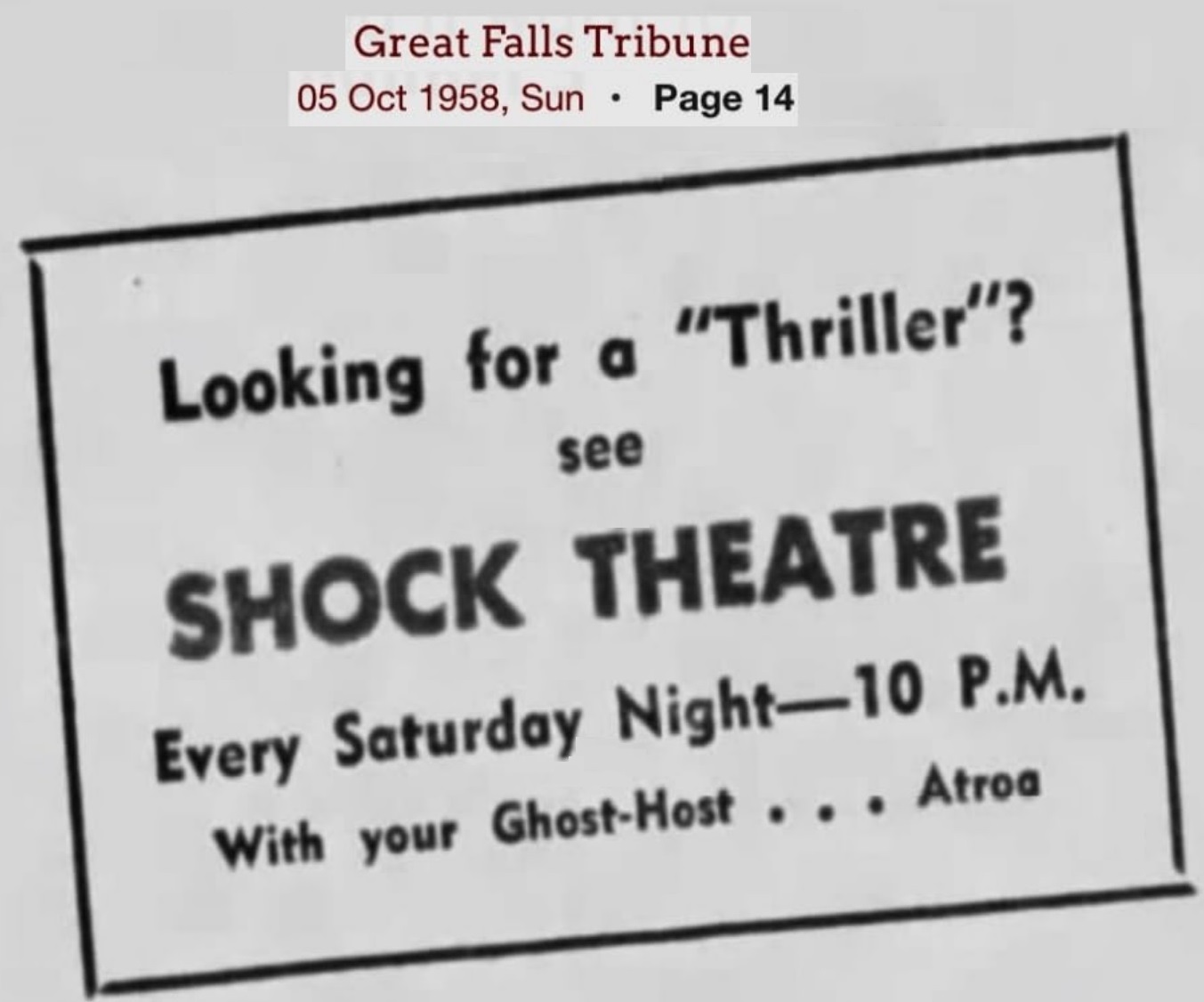 | "Shock Theatre" was a hosted horror show with "Atroa" presenting movies on KRTV-TV Channel 3, Great Falls, Montana from 1958-1959. The actor who played Atroa is not know, nor the exact dates that the show ran. The show ran every Saturday at 10:00pm, showing an assortment of movies from the horror and science fiction genres.
