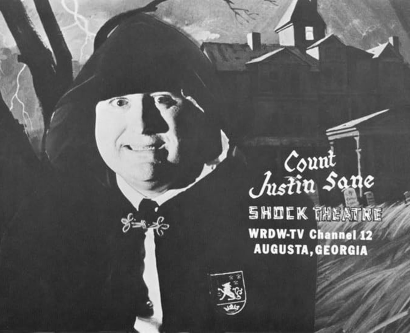"Shock Theatre" was a hosted horror movie show with Ed Meloan as "Count Justin Sane"![]() screening firstly on Saturday nights, then both Friday and Saturday nights on WRDW, Channel 12 Augusta, Georgia between the late 1960's to early 1970's. The coffin used on the show was made out of a couple of sheets of 3/4 plywood which was painted a dull grey. The handles did come from a real coffin. The inside of the "coffin" was lined with a wine-colored very heavy cloth that had originally been one of the stage curtains of the old Imperial Theater.