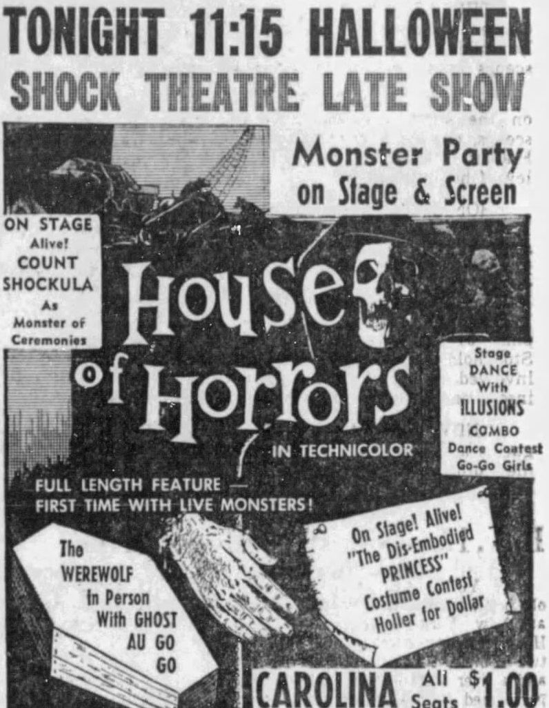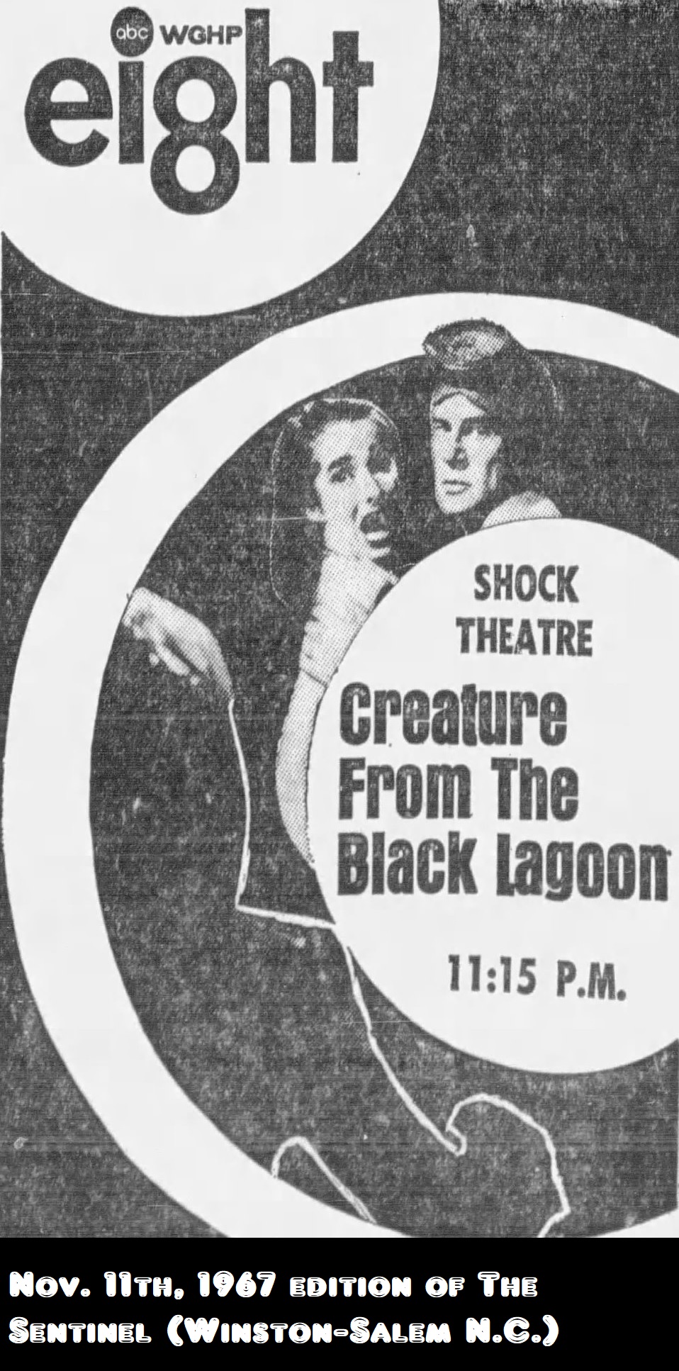 | "Shock Theatre" was a hosted horror movie show with Dick Bennick as firstly "Count Shockula" (1966-1966) and later "Dr. Paul Bearer" (1966-1971) presenting movies on Friday or Saturday nights around 11:15pm or 11:30 pm on WGHP, Channel 8 Winston-Salem, North Carolina from 1966 until 1971.