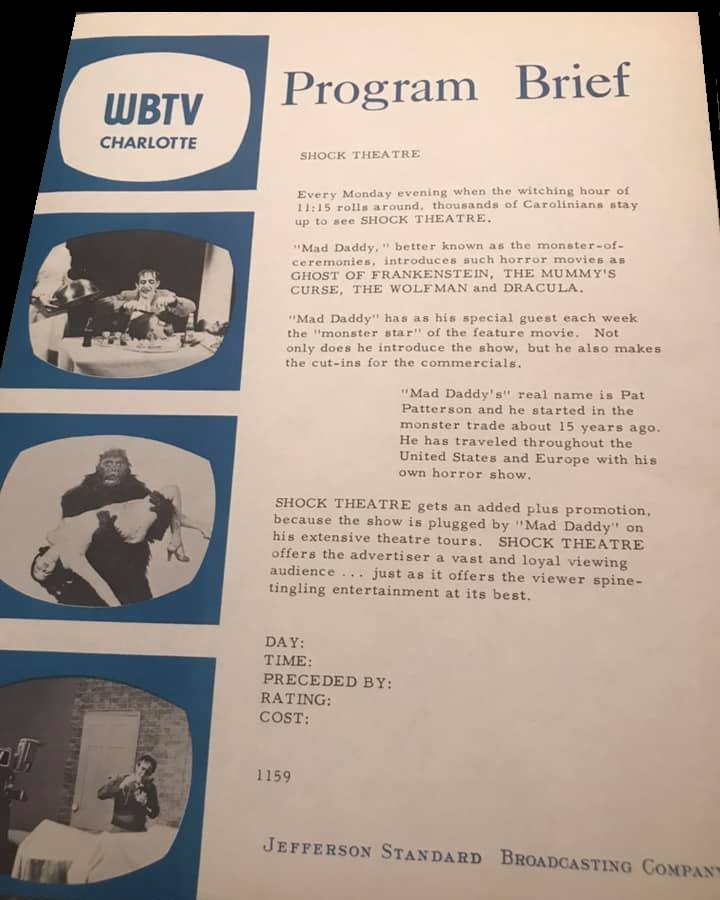 ![]() "Shock Theatre" was a hosted horror movie show with J.G. "Pat" Paterson as "Mad Daddy" presenting movies on Monday nights 11:15pm on WBTV, Channel 3 Charlotte, North Carolina from the Fall of 1958 until the Summer of 1959. Patterson's make-up consisted of simple grease paint scars, a fright wig and a blood-stained lab coat. "Mad Daddy" showed all of the "Shock" titles were run. House of Frankenstein was the first one shown, and the final one was Horror Island.
