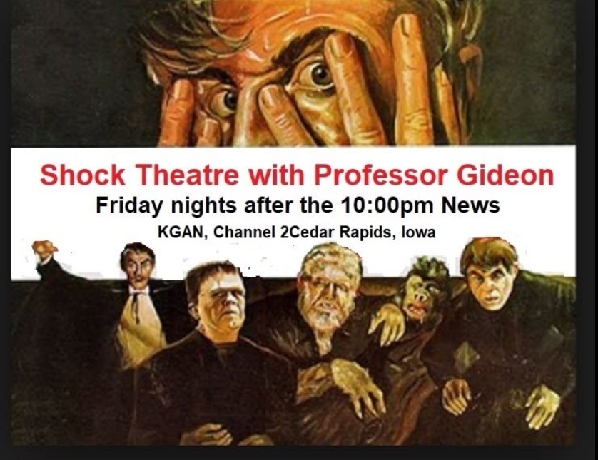 | "Shock Theatre" was a hosted horror movie show with Jim Petersmith as "Professor Gideon" presenting horror movies on KGAN Channel 2, Cedar Rapids, Iowa over a 13 week period around 1979. The show was screened after the 10:00 o'clock news on Friday nights. Movies screened where schlock and included "They Saved Hitler's Brain".