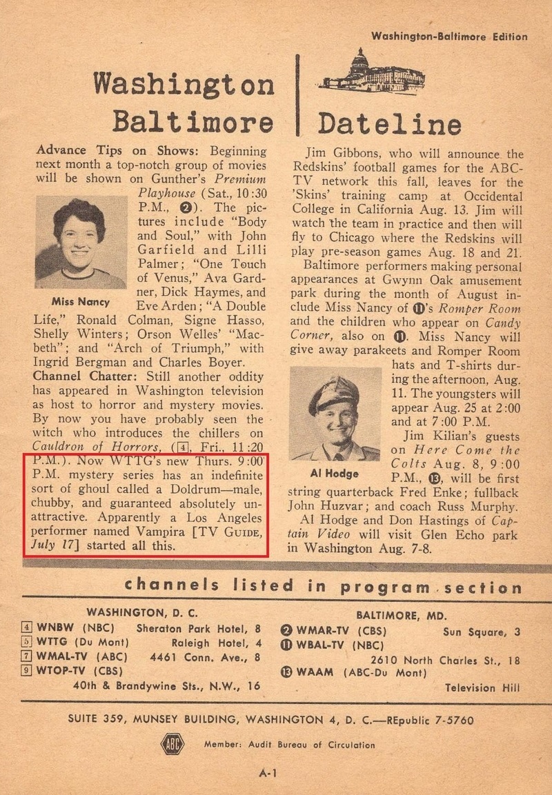 | "The Doldrum" was a hosted horror/mystery movie show with "Doldrum" presenting movies on Thursday nights at 9:00pm for WTTG Channel 5, Detroit, Michigan, USA from 5 August 1954 until 16 September 1954. "Doldrum" is a male ghoul, chubby and absolutely unattractive. The actor who played "Doldrum" is not known.