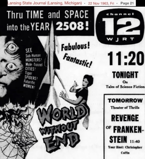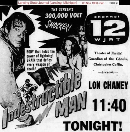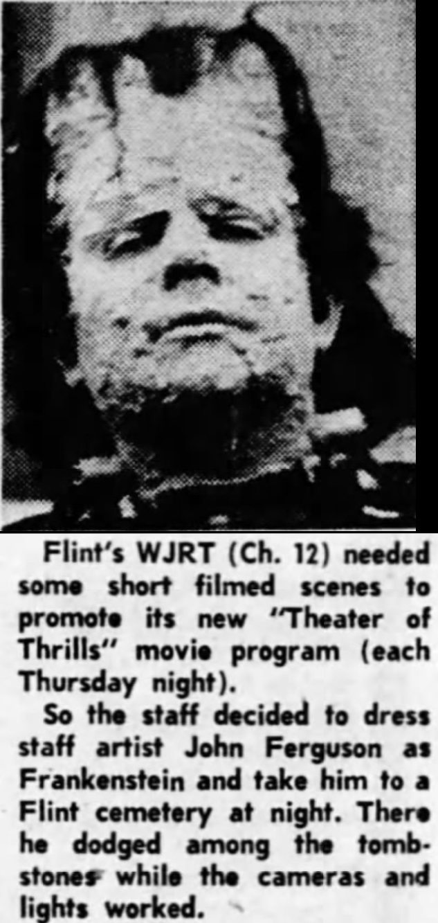 "Christopher Coffin" - biography (taken from Bradley Beard's Facebook page)" He was known as the Guardian of the Ghouls. Tonight I present Christopher Coffin, host of Theatre of Thrills on WJRT-TV Channel 12 in Flint, MI. The actual air dates for the show are in question, however, most sources cite them as 1963 to 1967. The character was created and portrayed by Reed Pasternak AKA Reed Farrell so that viewers would not recognize him as one of the commercial performers during the movie; the show was sponsored World Wide Home Furniture for whom Farrell did a large amount of commercial work. Christopher Coffin sat in a wheelchair wearing a black fedora and sunglasses and would speak in an echo-chambered voice. The show featured scary skits that played along with the plot of the movie. An actual graveyard set was produced behind the studio for the show as well.