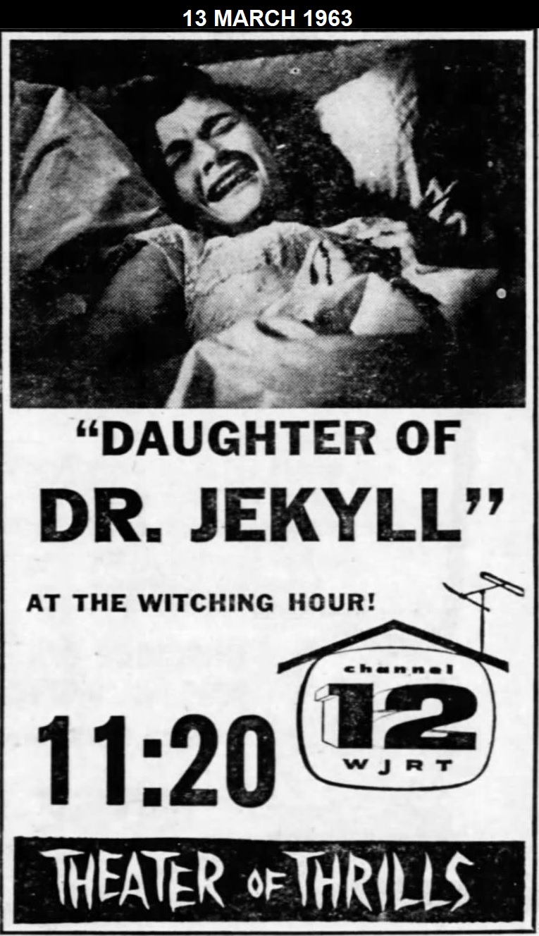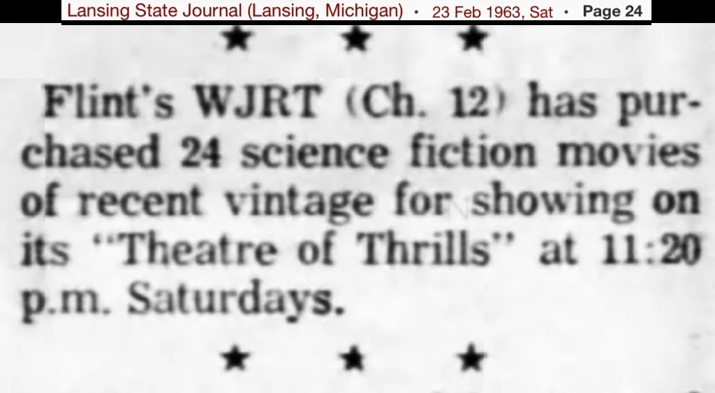 | "Theatre of Thrills" was a host horror movie show with Reed Pasternak (credited as Reed Farrell) as "Christopher Coffin" presenting movies on Friday nights at 11:30 pm on WJRT Channel 12 Flint, Michigan between 1961 until 1967. "Christopher Coffin" sat in a wheelchair, with a lap robe, and wore a black hat and sunglasses with a mustache/goatee beard. The segments included scary little skits that carried a plot that went on throughout the movie. Most times these themes tied into the movie's plot.
