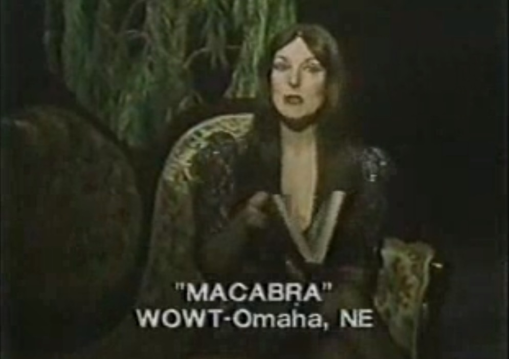![]() "Theatre of the Macabre" was a hosted horror movie show with "Macabra". The show was aired by WOWT, Channel 6, Omaha, Nebraska between 1982 till 1985, and was screened usually on Fridays, around 10:30pm. "Macabra" would often wear something appropriate to the film she was hosting , leopard skin tights; Egyptian garb for The Mummy. Other shows would have her wearing a night gown or an evening dress. ![]() ![]() The name of the actor is not known, with the only clue being that she was a local business person who wished to remain anonymous.