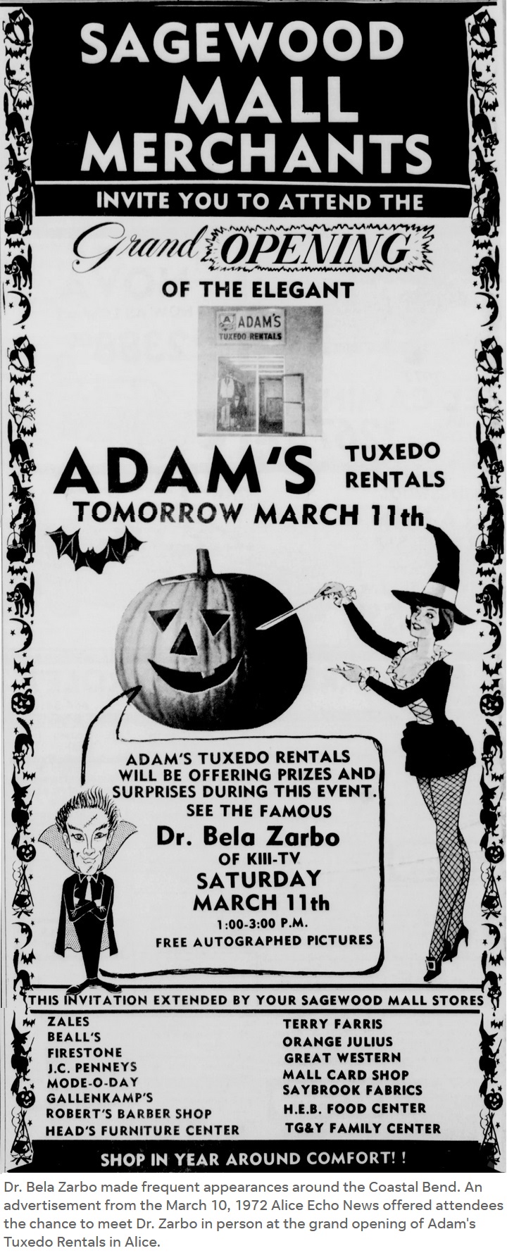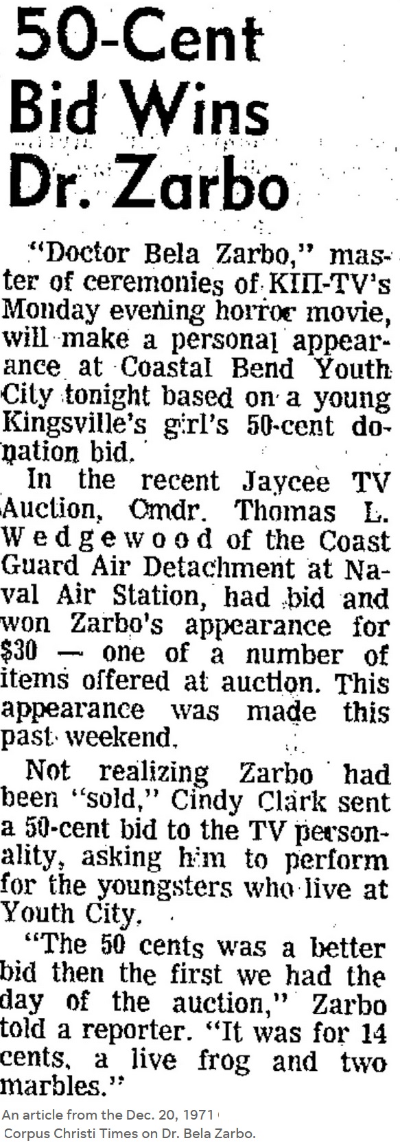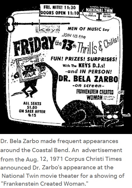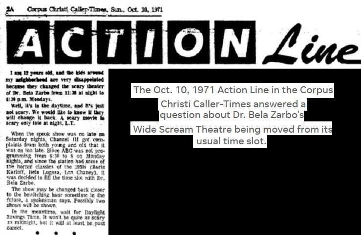 ![]() "Wide Scream Theatre" was a hosted horror movie show with Marvin Wheatley as "Dr. Bela Zarbo" presenting movies on Saturday nights at 11:30pm on KIII Channel 3, Corpus Christi, Texas from 26 September 1970 until 1973. The Doctor was assisted by Daphne Miller (credited as Dee Wray) as "LuRella" and Carl Arguell as "Trog". ![]() ![]() The first show screened at 11:35pm with the 1964 movie "The Evil of Frankenstein".