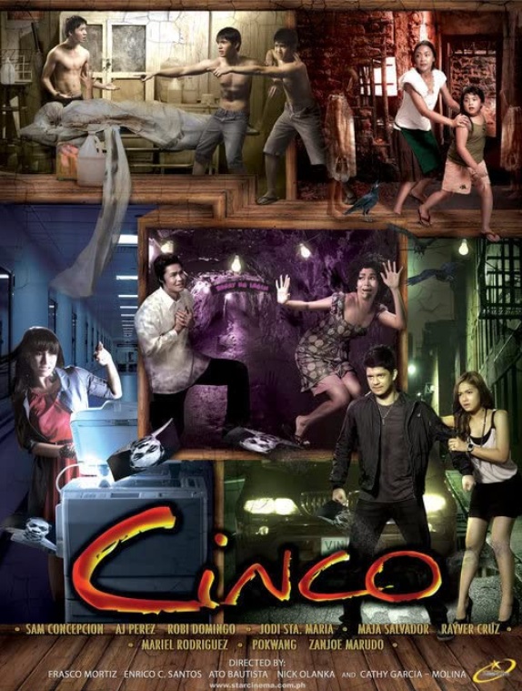 Cinco was a 2010 Filipino psychological supernatural, comedy, science fiction, horror non-hosted anthology movie, that was produced and released by Star Cinema. The movie consists of five different horror stories which each featuring an ensemble cast including Sam Concepcion, AJ Perez, Robi Domingo, Jodi Sta. Maria, Maja Salvador, Rayver Cruz, Mariel Rodriguez, Pokwang and Zanjoe Marudo and awere directed by Frasco Mortiz, Enrico C. Santos, Ato Bautista, Nick Olanka, and Cathy Garcia-Molina. The movie was released on 14 July 2010. The stories were: 1) Braso (Arm) 2) Paa (Feet) 3) Mata (Eyes) 4) Mukha (Face) 5) Puso (Heart) |