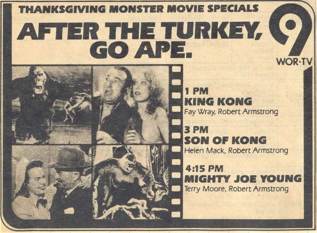 | "After the Turkey, Go Ape" was a non-hosted one day Thanksgiving monster movie specials, that screened on WOR-TV, Channel 9 in New York, New York, USA. The date is not known, but probably in the 1970s or 1980s.