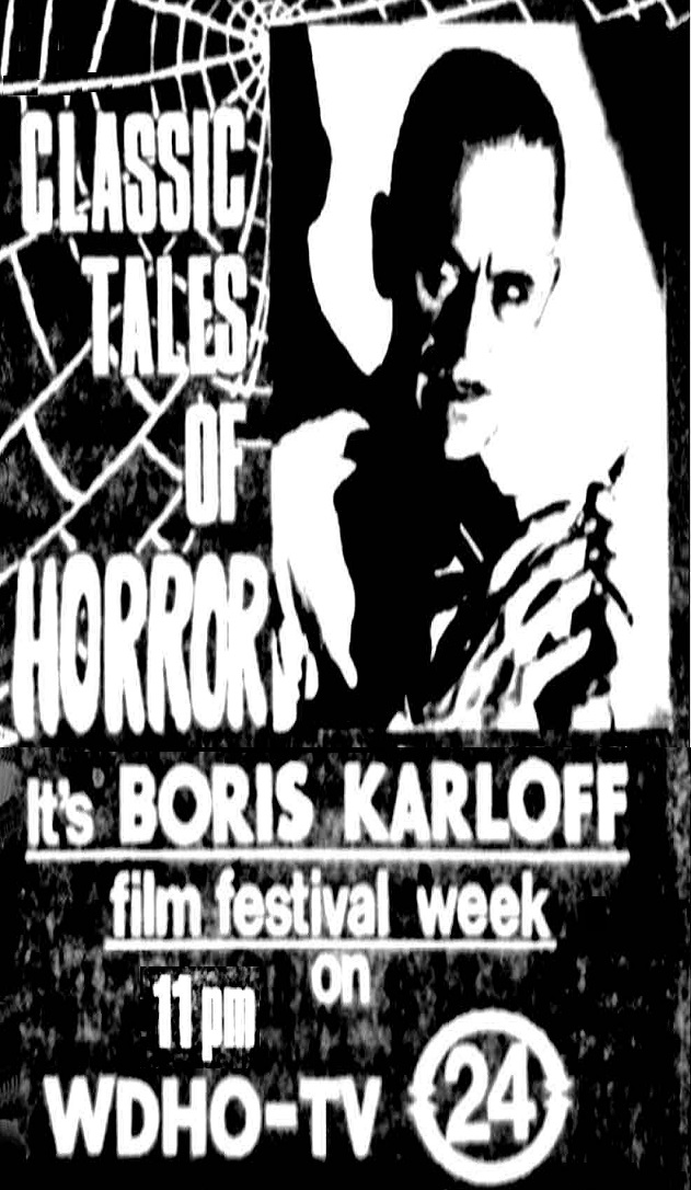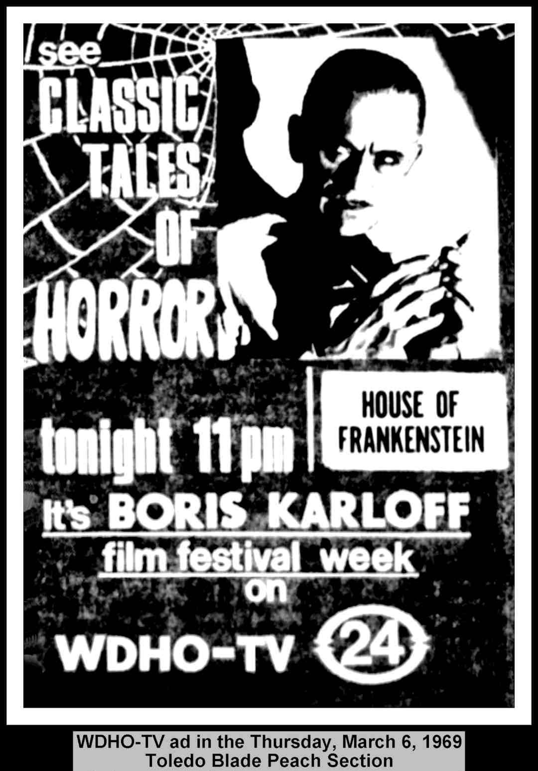 | "Classic Tales of Horror" was a non-hosted week long film festival showing classic Boris Karloff horror movies on WDHO-TV Channel 24, Toledo, Ohio, USA. The show ran during March 1969 in the evening at 11:00pm. The movie shown on 6 March was the 1944 "House of Frankenstein".